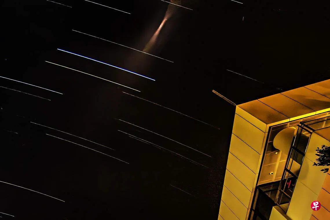 天琴座流星雨星期一(4月22日)划过星空,《联合早报》摄影记者凌晨约5时半在榜鹅综合社区中心通过重叠式曝光和长时间的定位摄影,捕捉到流星留下的轨迹,将美丽的瞬间定格在图片中。