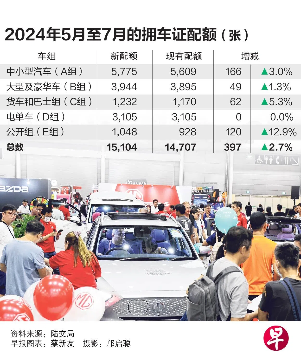 新加坡车业公会会长梁添丁说,整体配额增加约3%,虽不足以满足所有需求,但至少能让拥车证成价保持平稳。“汽车组别的成价即使上涨,幅度预计约几千元,应该不会到上万元。”