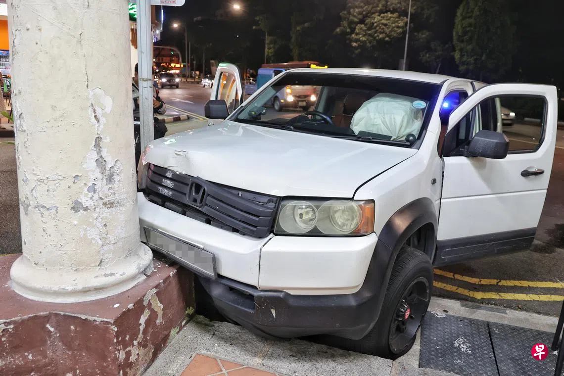 这起车祸发生在星期五(4月26日)晚10时50分,一辆白色运动型休旅车(SUV)撞上位于芽笼3巷,靠近G7新马沙煲活田鸡粥店的柱子。
