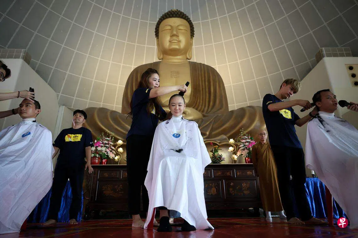 一年一度的公益筹款活动“散发希望”星期天(4月28日)正式在光明山普觉禅寺启动,包括陈欣淇在内的361名支持者当天剃发表达对患癌儿童的支持。