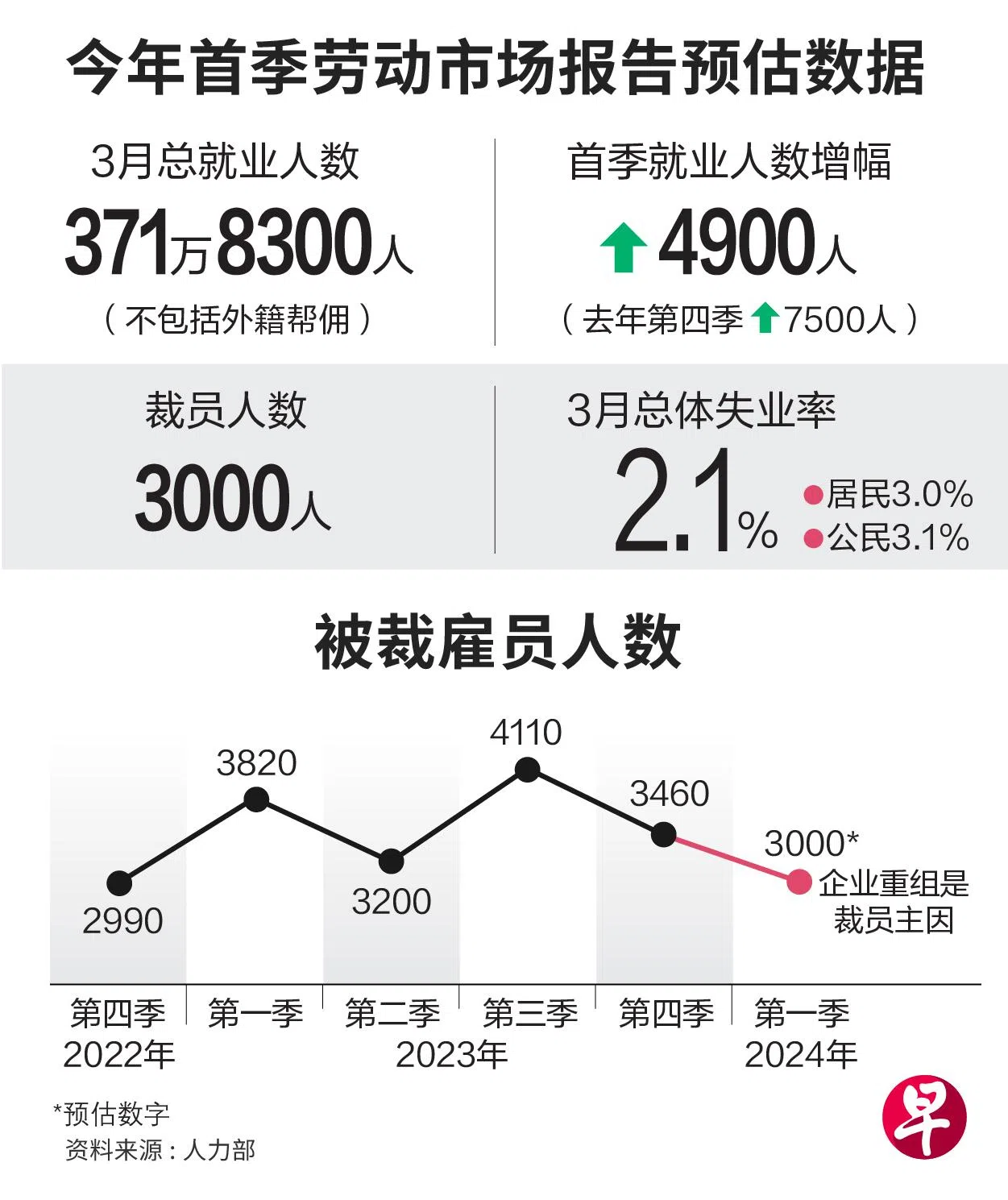 人力部星期二(4月30日)公布的2024年第一季《劳动市场报告》预估数据显示,不包括外籍帮佣在内,今年3月的总就业人口达371万8300人,就业人口连续10个季度增加,但增速趋缓。今年首季就业人口增幅为4900人,比上一季的7500人,少了2600人。