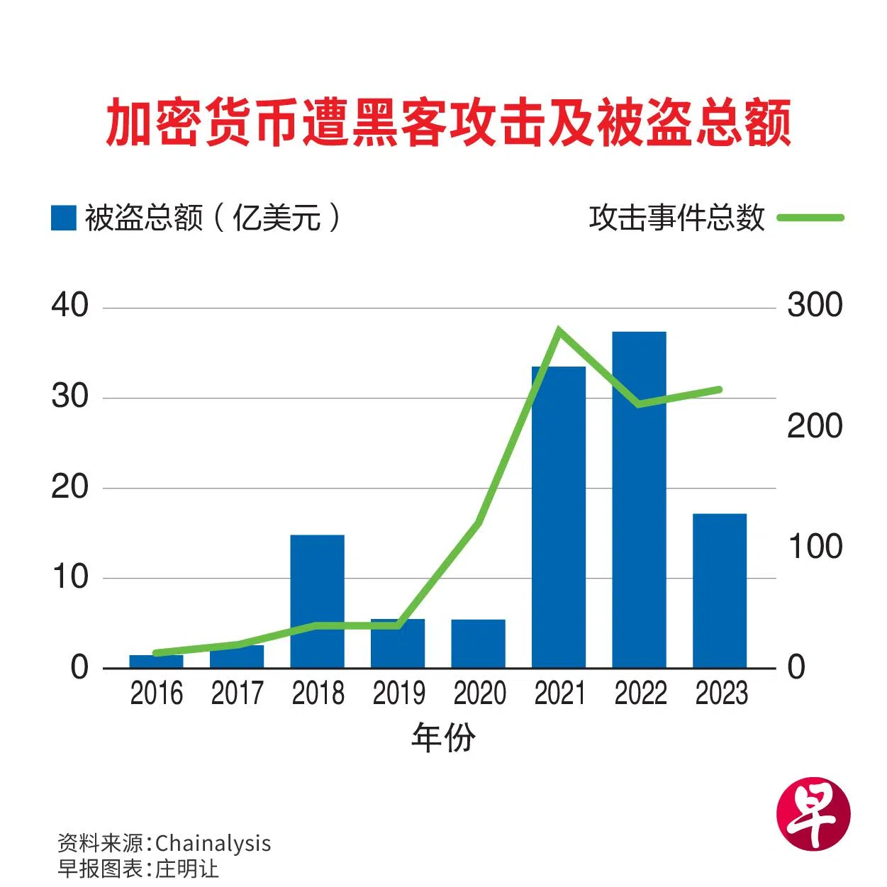 答:加密货币遭黑客攻击时有所闻。据总部位于美国的区块链数据分析平台Chainalysis统计,2023年共发生231起黑客攻击事件,比前一年增加12起。去年被黑客盗走总额为17亿美元(约22亿9600万新元),与前一年相比锐减54%,这是因为黑客攻击去中心化金融(Decentralized Finance,简称DeFi)盗走的金额显著减少,从2022年的31亿美元,锐减逾六成至去年的11亿美元。