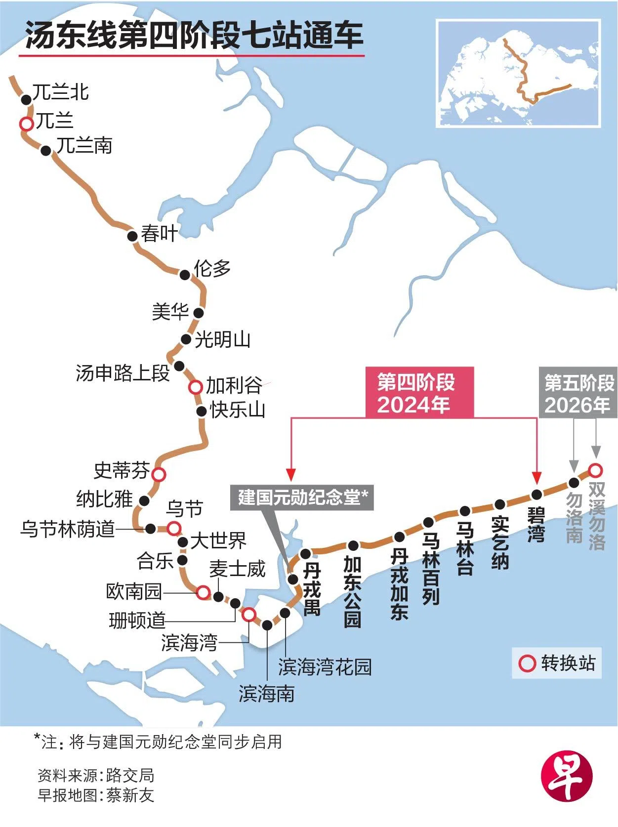 全长10.8公里的地铁汤申—东海岸线(简称汤东线)第四阶段将于6月23日通车,七个新地铁站为丹戎禺、加东公园、丹戎加东、马林百列、马林台、实乞纳及碧湾(Bayshore)。其中,加东公园和丹戎加东站来回方向的月台设在不同楼层。