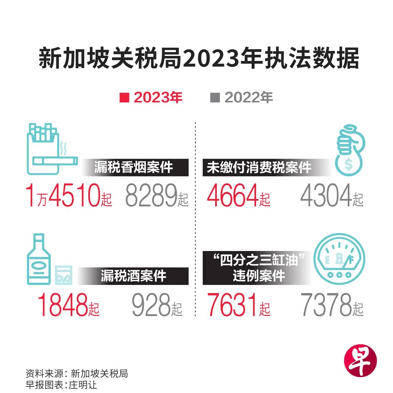 在漏税香烟方面,关税局去年侦获1万4510起漏税香烟案,同2022年的8289起相比,增加近75%。