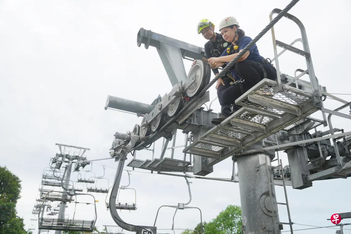 穿上防坠安全带,再爬上空中吊椅的支撑塔检查零件,确保整个系统能运作无误,对建设局高级工程师陈汝瑄(48岁)和李思敏(33岁)而言是家常便饭。她们隶属建设局机械与电子工程部,负责维护本地游乐设施的安全。
