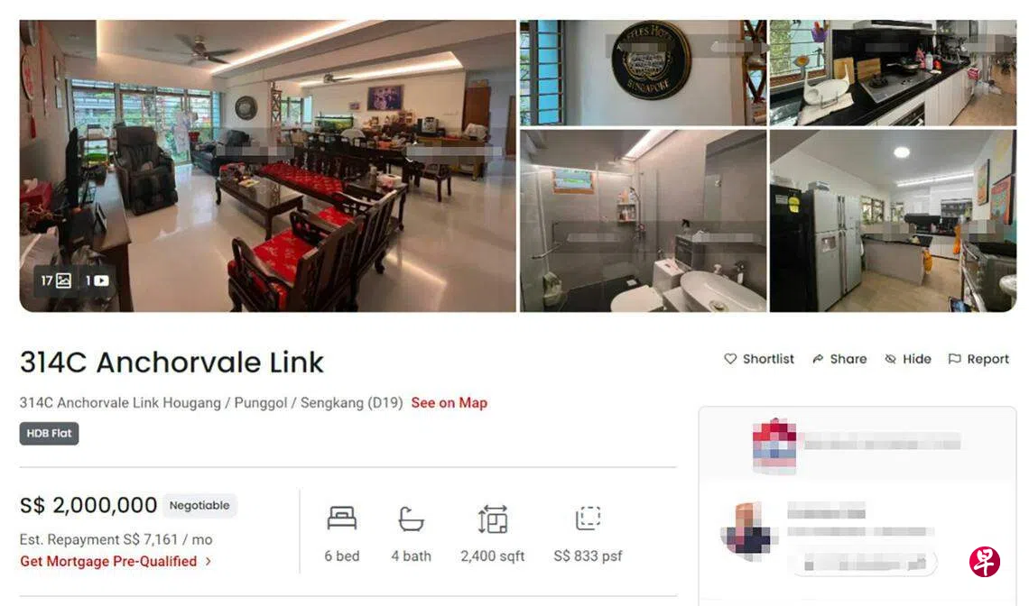 这则售屋广告近日贴上房地产交易平台PropertyGuru,引发热议。广告称安谷连路第314C座组屋一个“霸级组屋”(jumbo flat)求售,面积约2400平方英尺,有六个卧室和四个厕所,要价200万元。