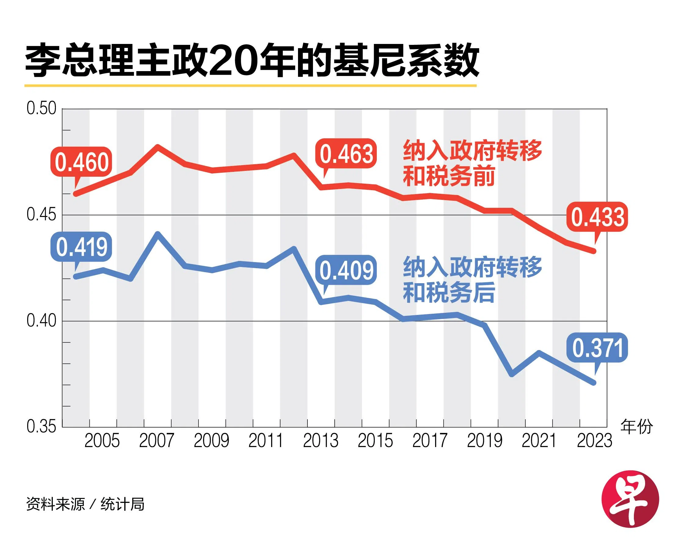 收入不平等课题也日益受到关注。李总理主政20年,我国受雇居民基尼系数(纳入政府转移和税务后)从2004年的0.419,缩小至2023年的0.371。