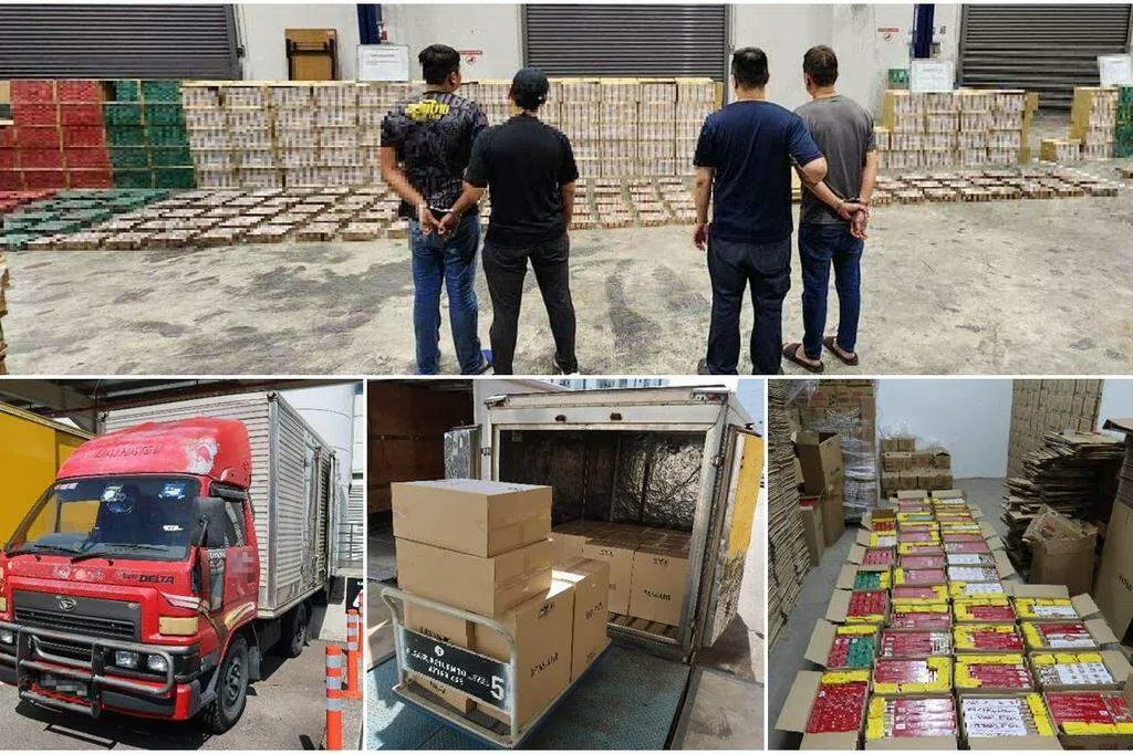 执法人员突然现身,从汽车后车厢起获240条漏税烟,跟着进入单位搜查,再从里头搜出2997条漏税烟。一名24岁的新加坡籍男子和一名37岁的马来西亚籍男子随即被捕,在装卸区附近徘徊的一名42岁马来西亚籍男子也被捕。