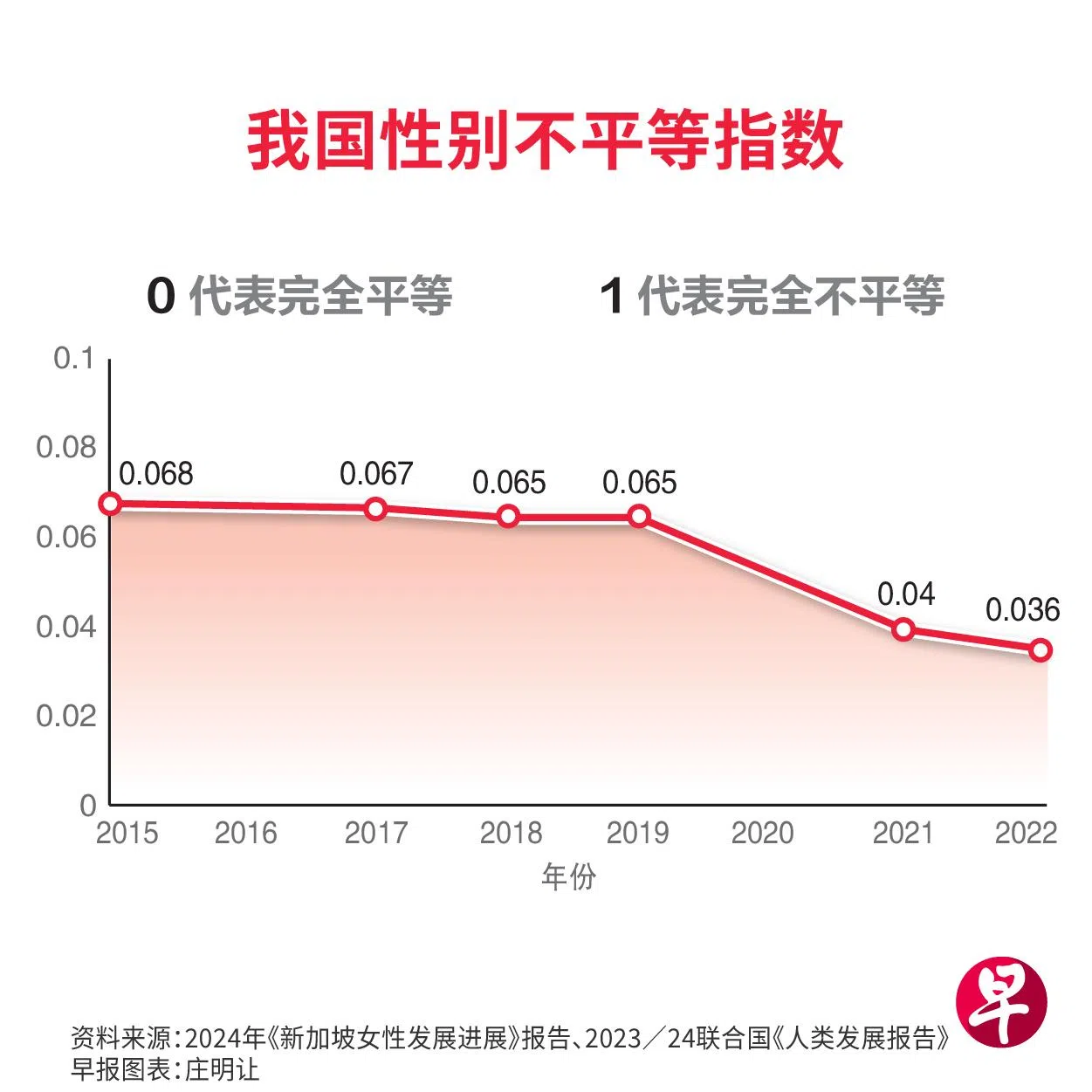 社会及家庭发展部星期五(5月10日)发布2024年《新加坡女性发展进展》(Progress on Singapore Women’s Development)报告。当局引述了2023/24联合国《人类发展报告》(Human Development Report)的数据指出,我国性别不平等指数(Gender Inequality Index,简称GII)从2015年的0.068,改善至2022年的0.036(0表示“完全平等”),这表明我国女性在生育健康、就业、教育,以及政治参与度等方面都进步了,在两性平等方面也维持较高的国际排名。