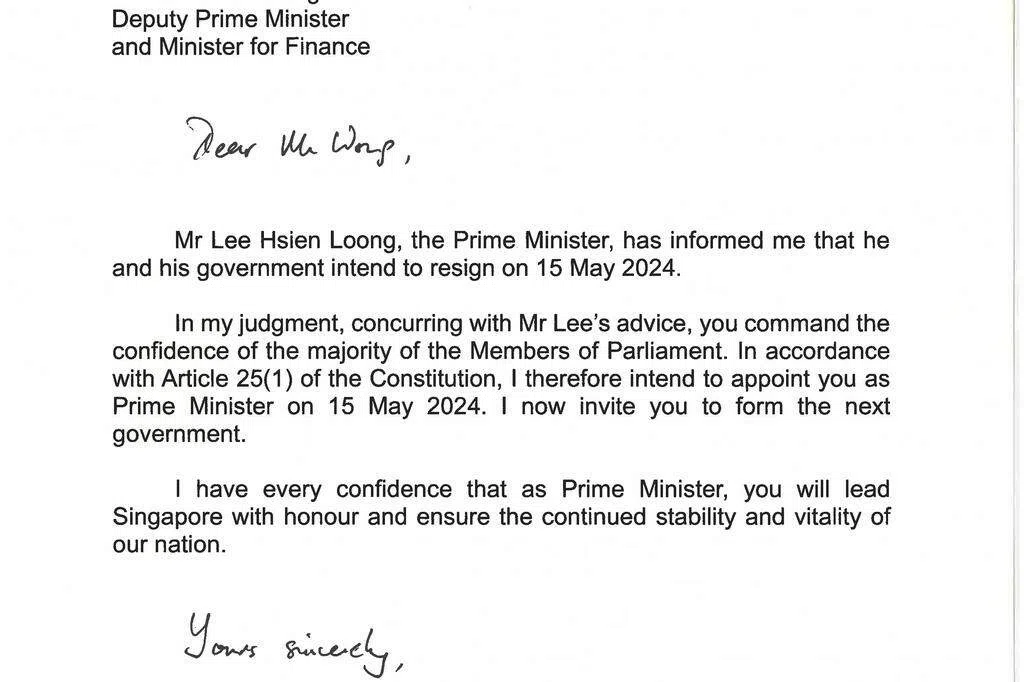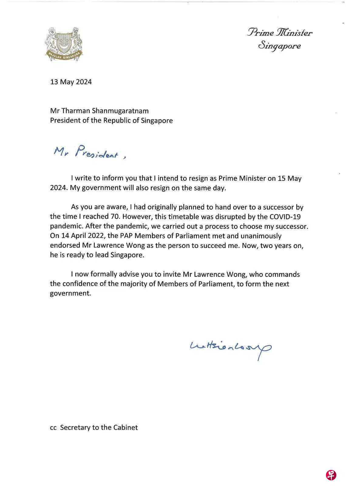 谨此致函通知您,我打算于2024年5月15日辞去总理职务。我的政府也将在同一天辞职。