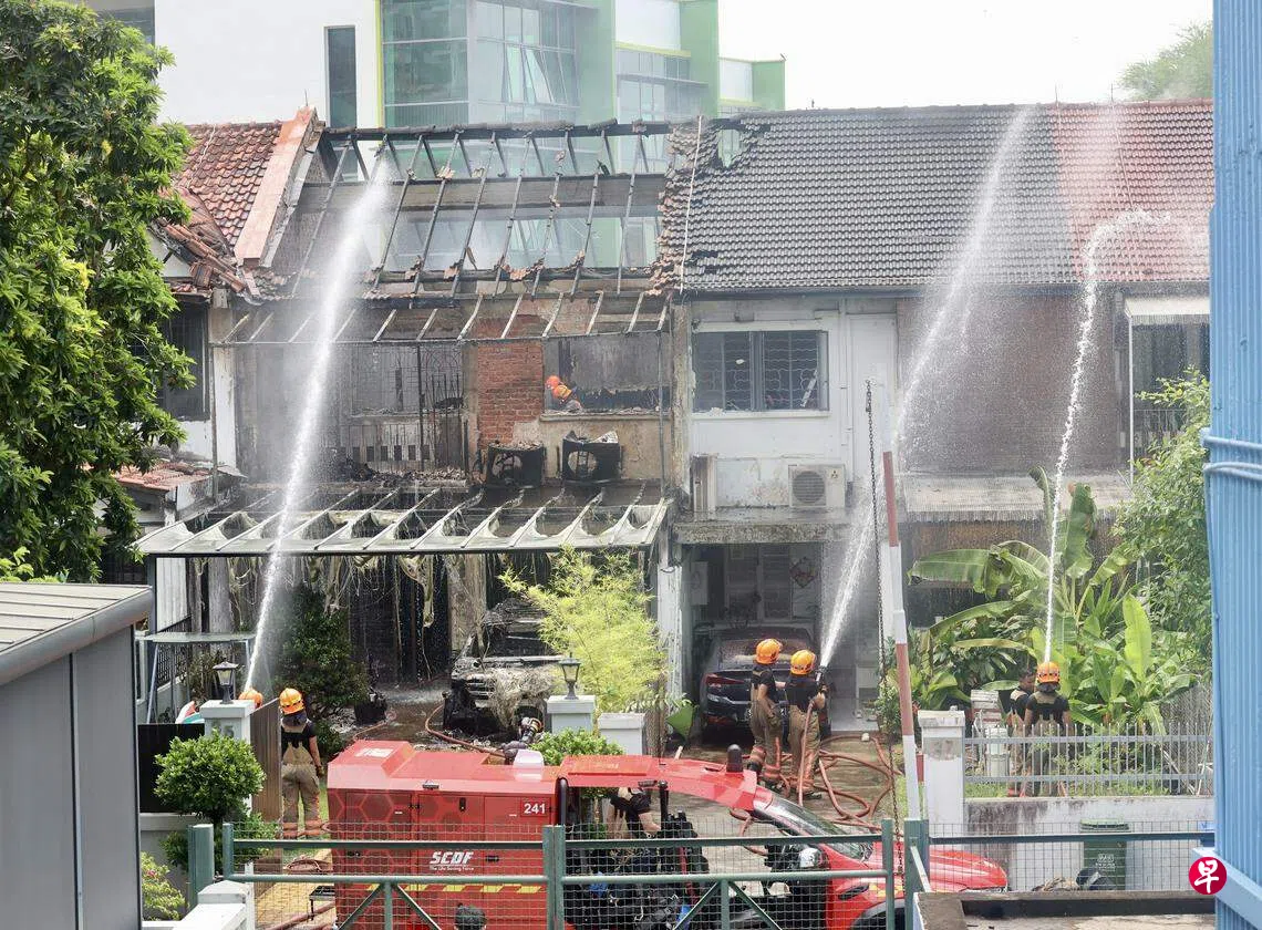 新加坡民防部队过后在脸书发文说,民防人员抵达现场时,大火已将排屋吞噬,他们于是在排屋前后,以及毗邻三间单位部署了多达七支水枪,展开灭火和阻止火势蔓延的工作。