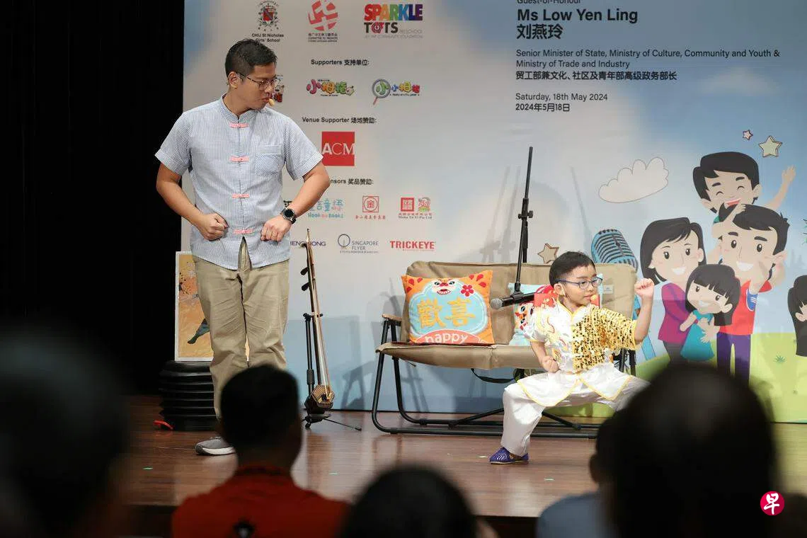 这对父子携手参加了第12届讲华语运动亲子才艺比赛。这个比赛的决赛星期六(5月18日)在亚洲文明博物馆举行,24个亲子参赛组合须在四分钟内,以“小时候”为主题,通过各种形式来讲述他们的故事。比赛分为学前组、小学一至二年级组和三至六年级组。