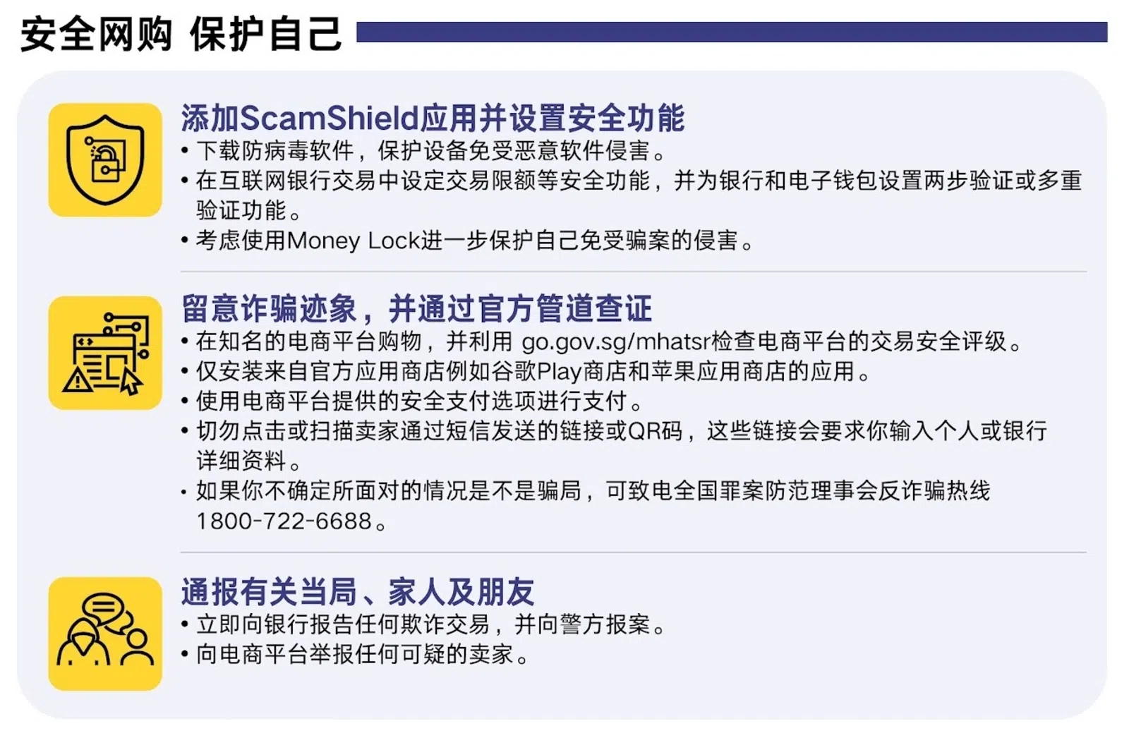 公众在那些未具备所推荐的防范措施的商务平台进行交易时,应更加谨慎。具体来说,购物者应“仅与商务平台利用政府发出的文件验证过身份的卖家交易,验证方式包括身份证号码或机构识别号码(UEN)”。