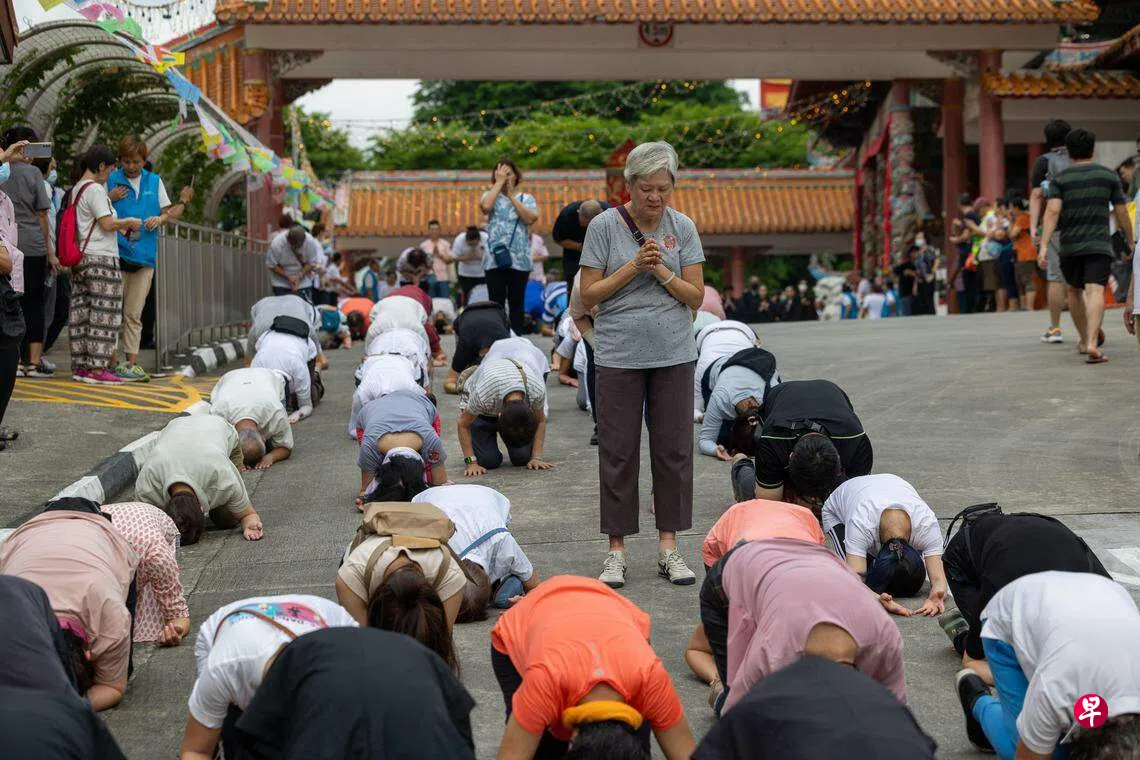 杜伟祥(51岁,自雇者)带着一家五口前来。他说:“我们都是佛教徒,聚在一起是缘分,希望能在这里净化身心,期待接下来风调雨顺,平平安安。”