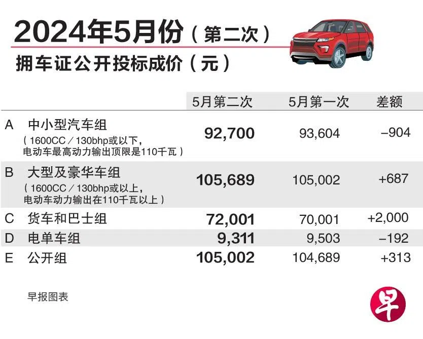 5月第二轮拥车证公开投标活动星期四(5月23日)下午结束,应对大众市场需求的中小型汽车组(A组)成价下滑904元(0.97%),报9万2700元。