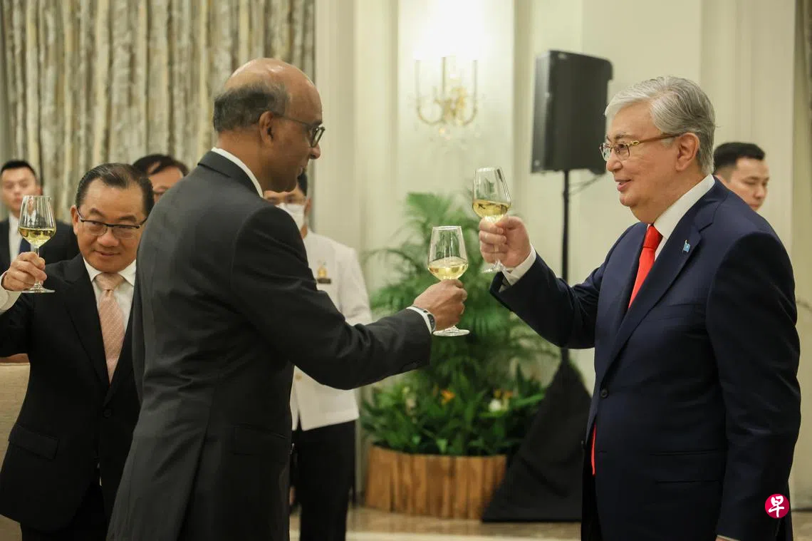 尚达曼总统在星期四晚上为托卡耶夫设的国宴上说,企业服务和投资协定是新加坡在欧亚经济联盟—新加坡自贸协定框架下,与中亚国家签署的首个双边协定。