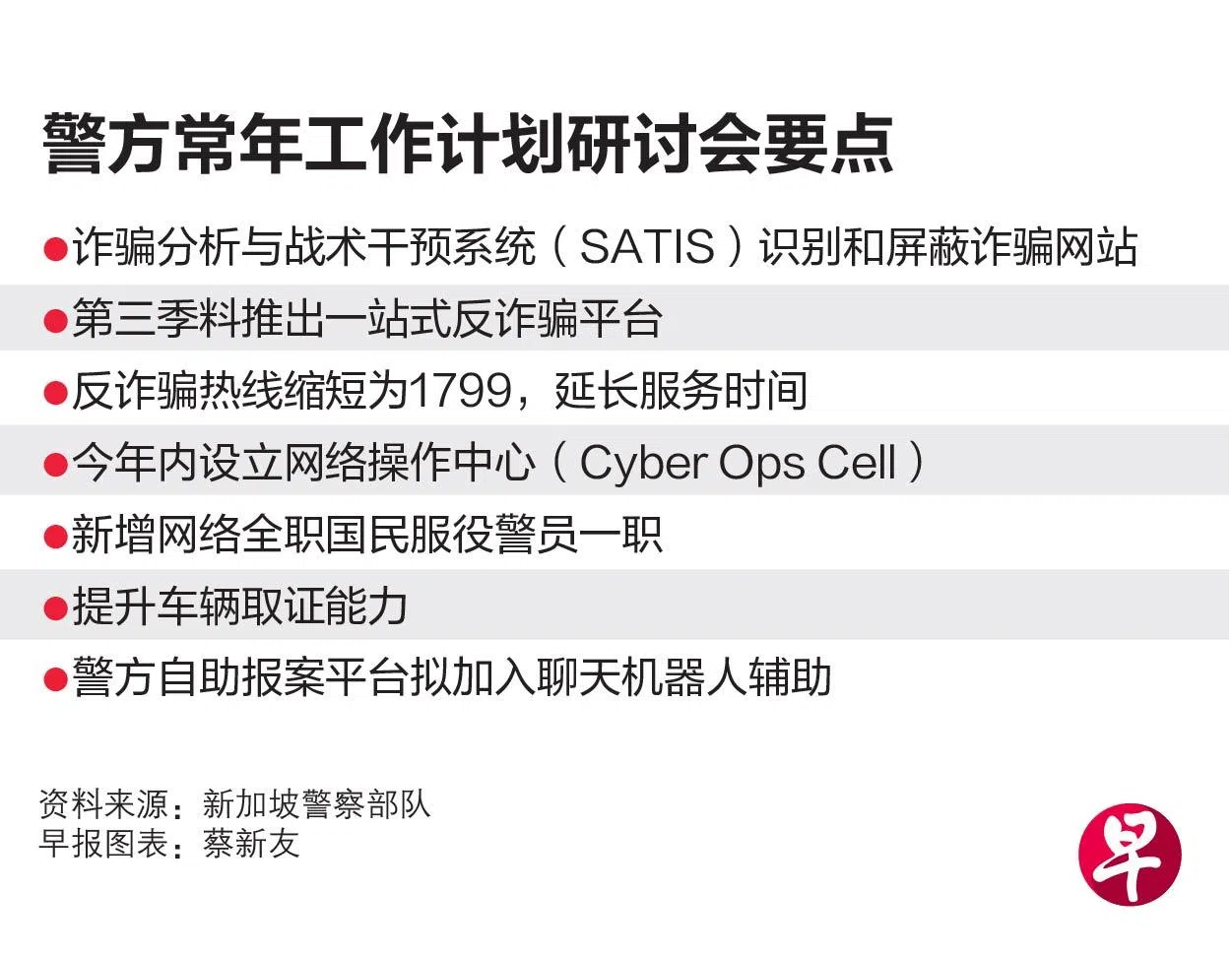 此外,警方将新增网络全职国民服役警员(Cyber PNSF)一职。这些熟悉网络技术的人员将被部署到网络罪案指挥中心和反诈骗指挥处,担任操作员,执行追踪网络威胁和阻断骗局的工作。警方将在今年8月公布更多有关详情。