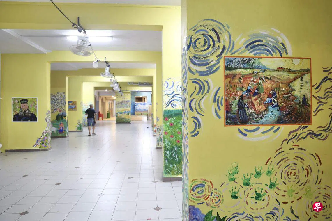 除了组屋底层的这个社区画廊,比笔路第55座组屋周围也有好几幅以梵高为主题的壁画。陈佩玲说,如今社区画廊“室内”部分的修复工程已经完成,接下来他们将聚焦为户外及更大的壁画进行修复。