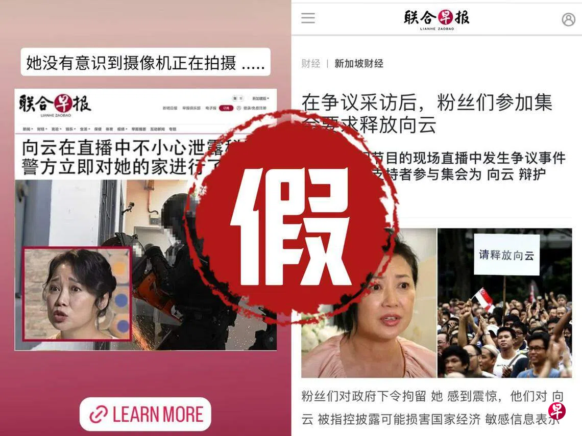 有网民星期二(5月28日)在脸书上发现一则带有网站链接的推送赞助贴文(Sponsored Post),其中有两张截图:一张是向云的假脸书账号,另一张是伪造的《联合早报》与向云微信聊天记录。这个脸书账号名是“香云”,但头像用了向云的照片。