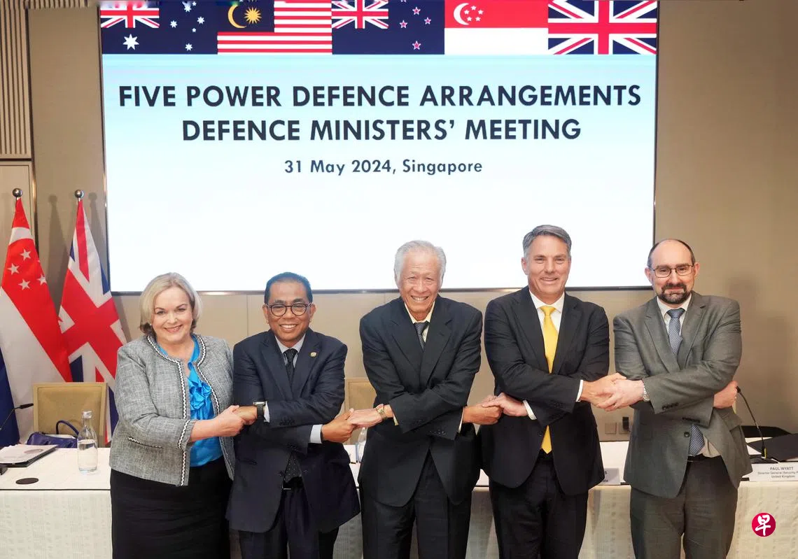由新加坡、马来西亚、澳大利亚、新西兰和英国组成的五国联防安排(Five Power Defence Arrangements,简称FPDA)星期五(5月31日)上午在新加坡乌节康莱德酒店(Conrad Singapore Orchard)召开第12届国防部长会议。