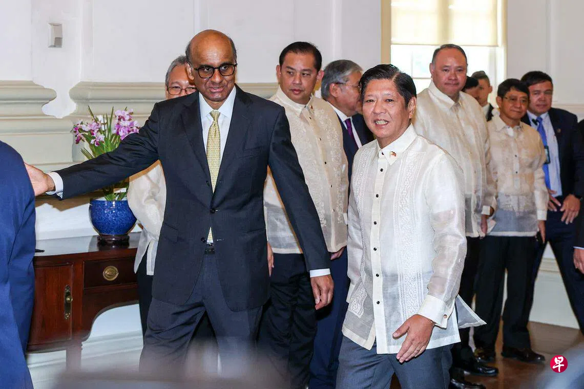 新加坡和菲律宾今年庆祝建交55周年,到访的菲律宾总统小马可斯到总统府同尚达曼总统会面时,双方对两国热情友好的关系,以及多方面的合作表示肯定。