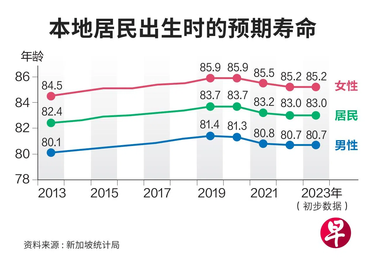 新加坡统计局星期四(6月6日)发布的最新数据显示,2023年本地居民出生时的预期寿命为83.0岁,较2013年的82.4岁,延长了0.6年。