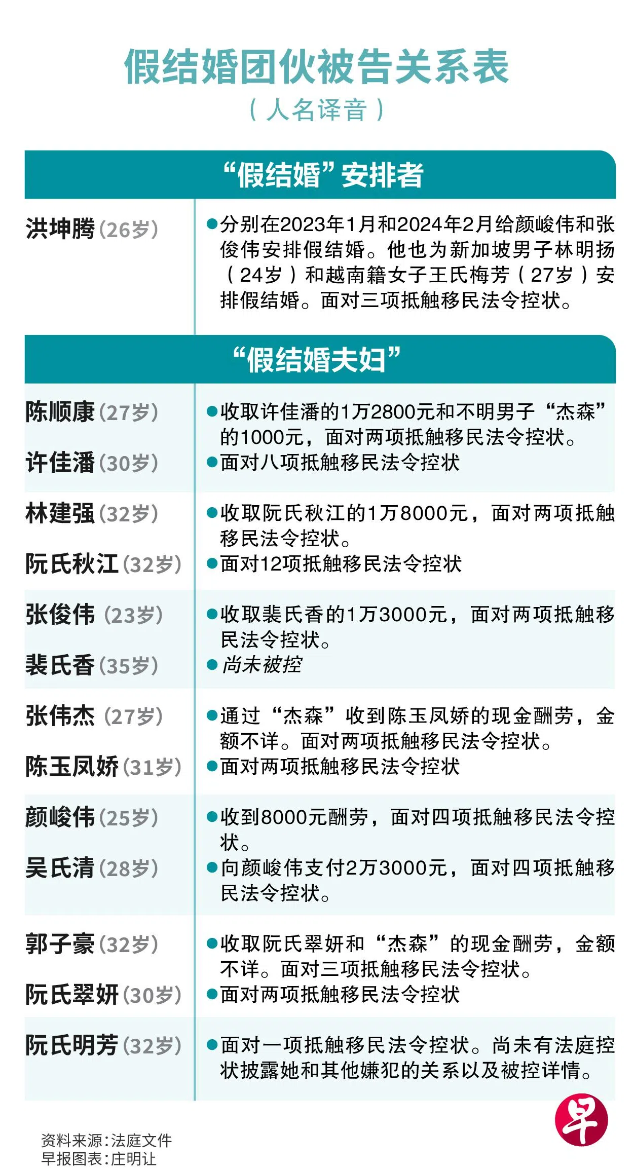 被控的新加坡籍“新郎”当中,陈顺康(27岁)收了越南女子许佳潘(30岁)的1万2800元和一个叫“杰森”的身份不明者的1000元;林建强 (32岁)收取了阮氏秋江(32岁)的1万8000元;张俊伟 (23岁)收取了裴氏香(35岁)的1万3000元;张伟杰 (27岁)也通过“杰森”,收到陈玉凤娇(31岁)的现金酬劳,金额不详。