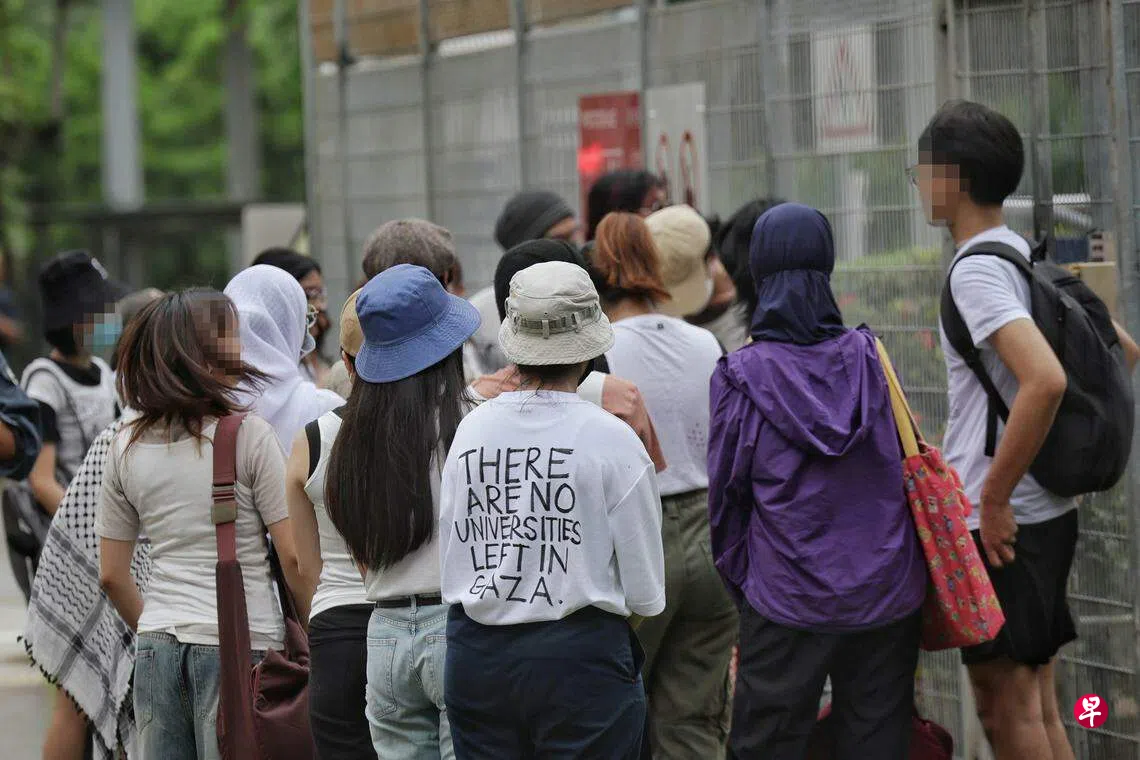 内政部大楼集会前,《海峡时报》记者在附近地铁站看到有人身穿写有“加沙没有大学了”(There Are No Universities Left in Gaza)标语的白色上衣。