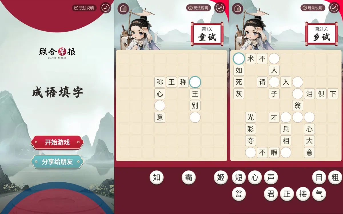 从字库里选择正确的字填到指定空格处,组合成正确的成语,就可以自动进入下一关。游戏分为童试、乡试、会试和殿试不同等级,共有100关。一旦选择错误的单字,便会闯关失败,所以在选字的时候,一定要看清楚现在填的是哪个格子。