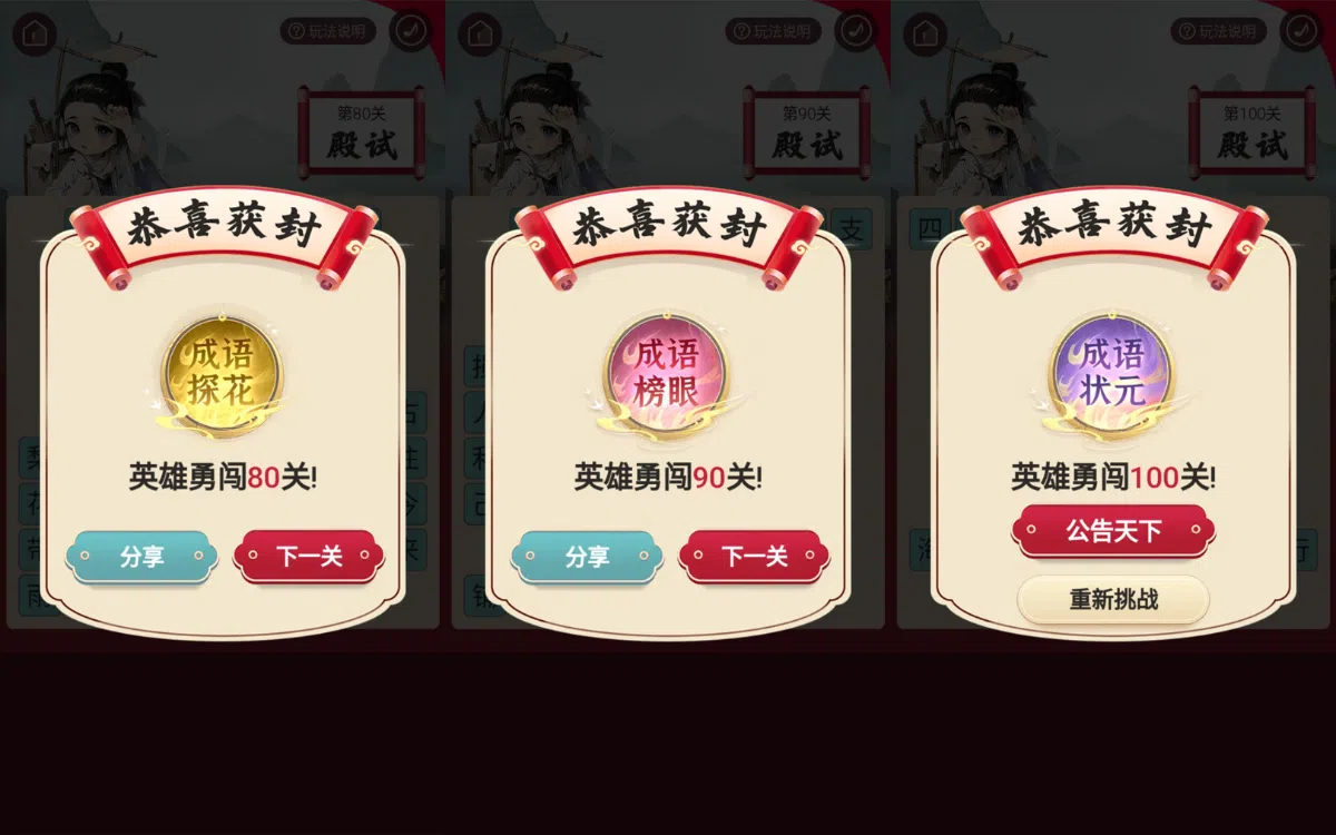 完成10关即可获得“成语秀才”的称号,25关成为“成语举人”,50关进阶为“成语贡士”,60关升级为“成语进士”,80关晋升成“成语探花”,90关贵为“成语榜眼”,完成100关时,玩家便问鼎“成语状元”。