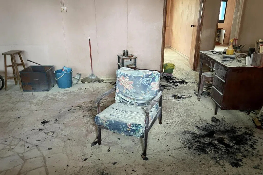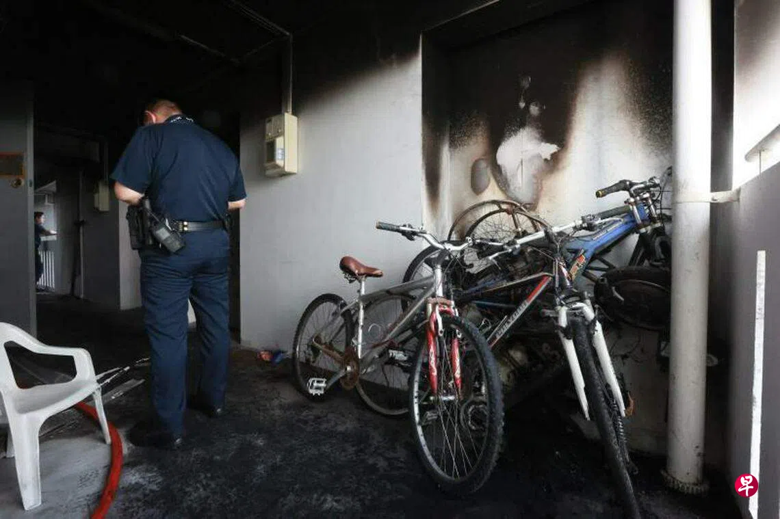 现场照片显示,失火地点位于组屋四楼的走廊尽头。火势被扑灭后,走廊满地灰烬,天花板和墙面都被熏黑,遭到不同程度的破坏。停放在走廊的数辆脚踏车都被烧剩铁架,有警员到场驻守调查事件经过。