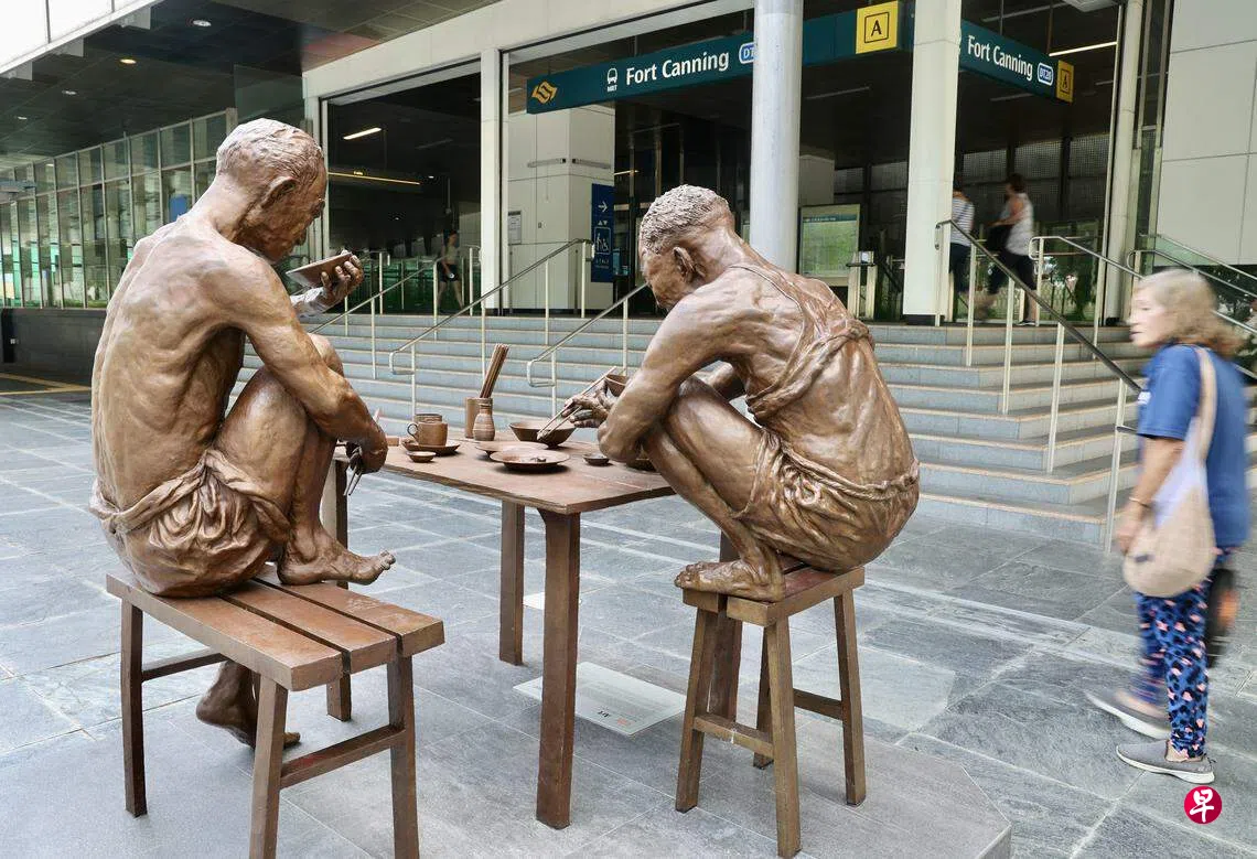 这是本地雕塑家张华昌的作品“又一天”(Another Day),将殖民地时期新加坡河畔常见的景象,栩栩如生地定格在市区线福康宁站(Fort Canning)A出口外。