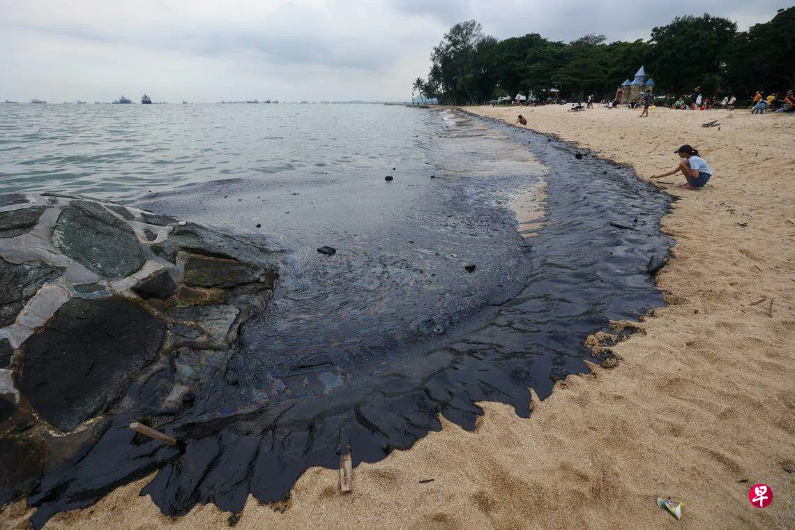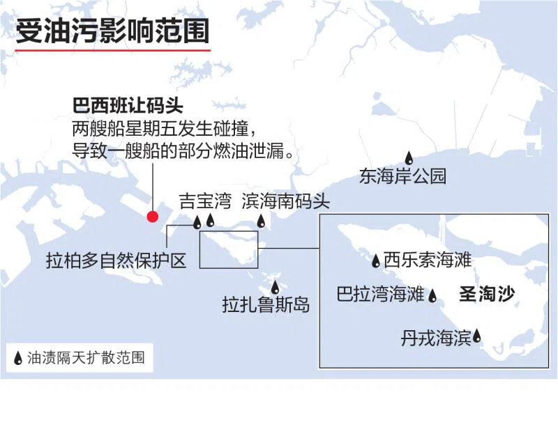 巴西班让码头发生船只相撞事故后,圣淘沙、南部岛屿和东海岸等多处的水域出现大片油渍,其中圣淘沙的海滩全面关闭清理,并禁止人们进行水上活动。