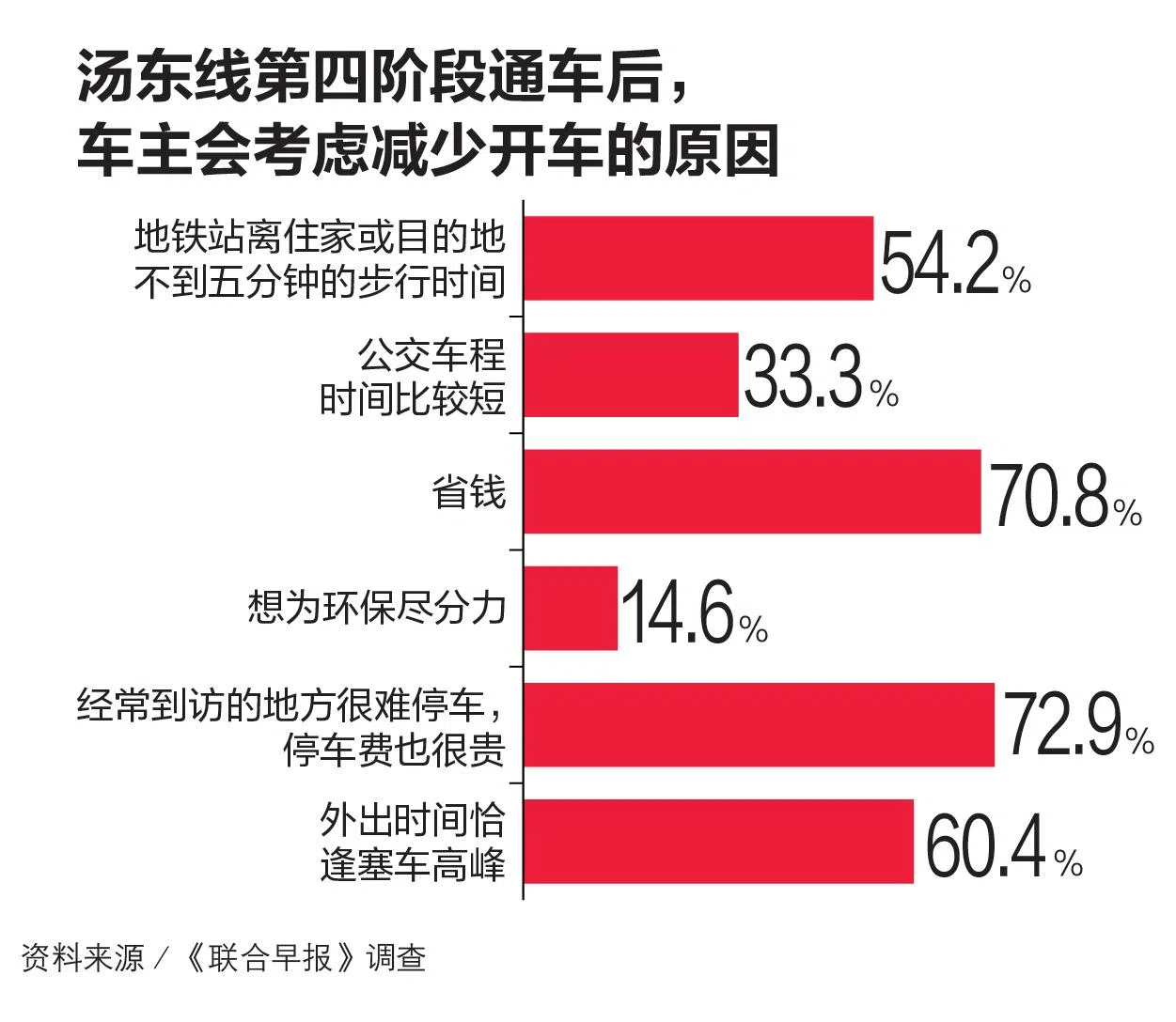 虽然大部分受访车主不会放弃拥车,但88%会在汤东线第四阶段通车后减少开车,多搭地铁和巴士外出。三大原因包括经常到访的地方很难停车,停车费也很贵;为了省钱;外出时间恰逢塞车高峰。