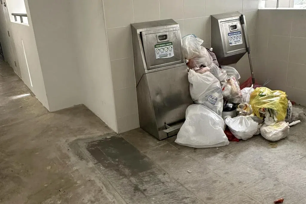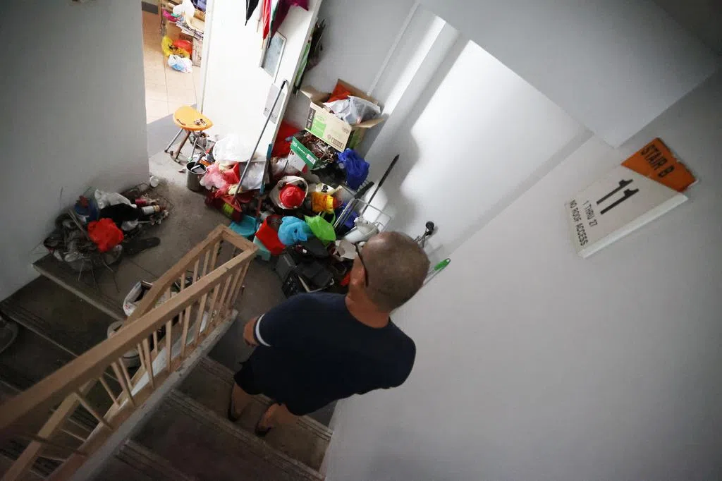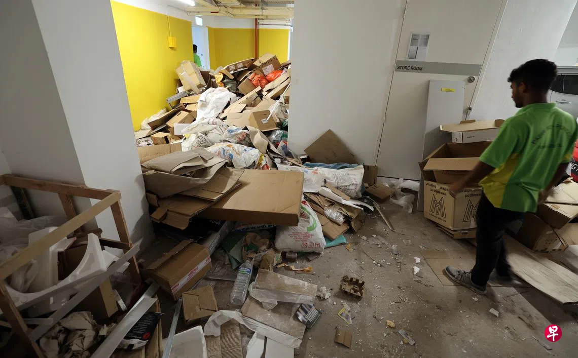 榜鹅新组屋区底层成垃圾槽,有居民申诉,不负责任的装修商与住户乱丢纸皮、木棍等,恐有火患隐忧,还目睹年长者险些跌倒。