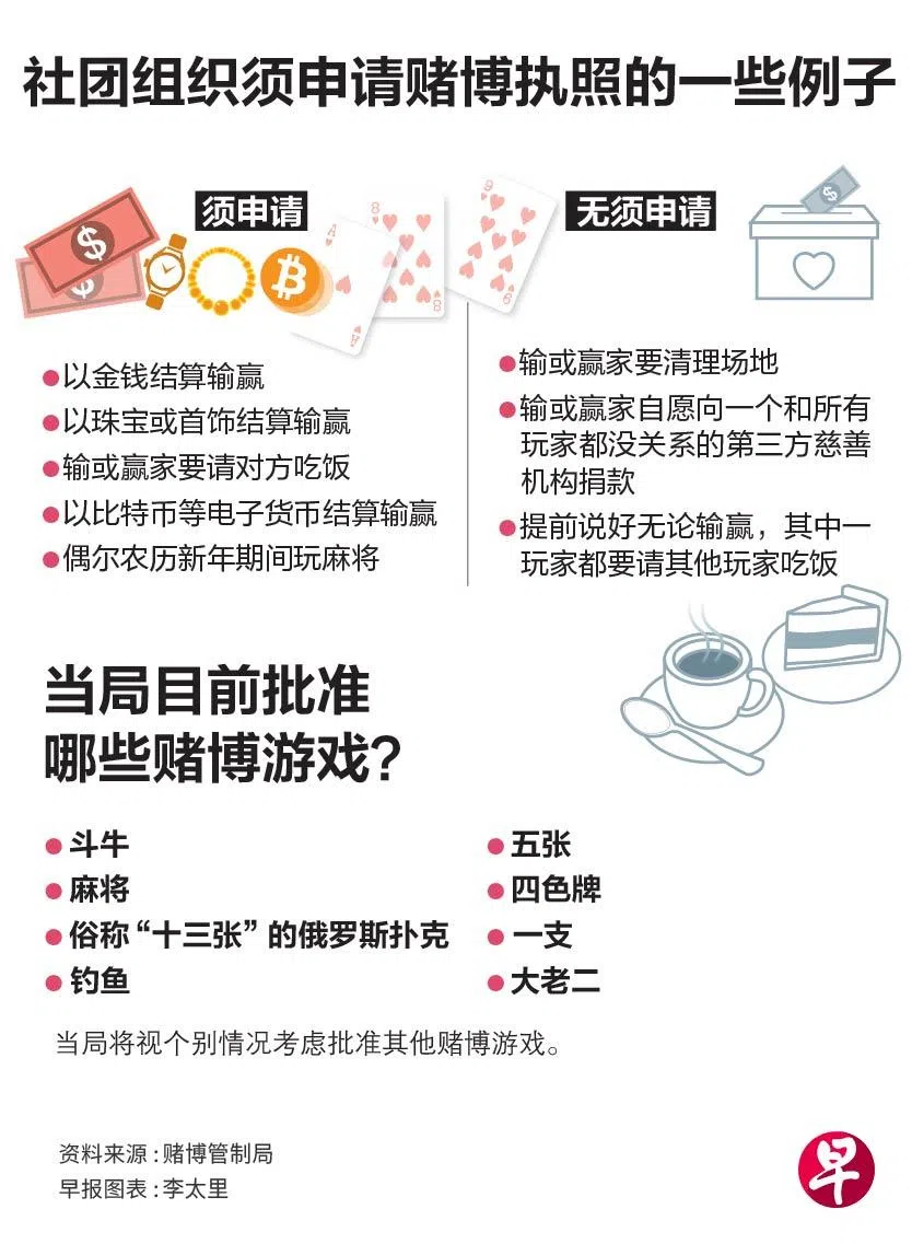 赌管局指出,新法令下,即使是以社交休闲为目的,俱乐部、合作社、工会、互助会等社区组织,只要赌博游戏的输赢涉及金钱,和有价值的赌注,都须申请执照。