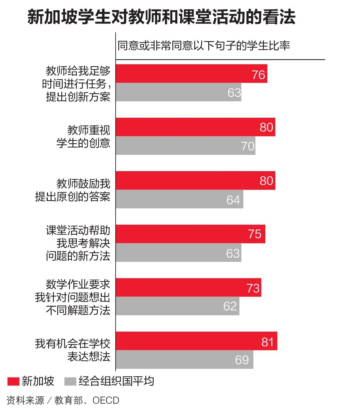80%的本地学生认为,教师重视学生的创造力,这一比率高于OECD的平均水平70%。同样有80%的本地学生认为,教师鼓励他们提出具创意的答案,高于OECD的平均水平64%。81%的学生表示,在学校有机会表达个人的想法,这也高于OECD的平均水平69%。