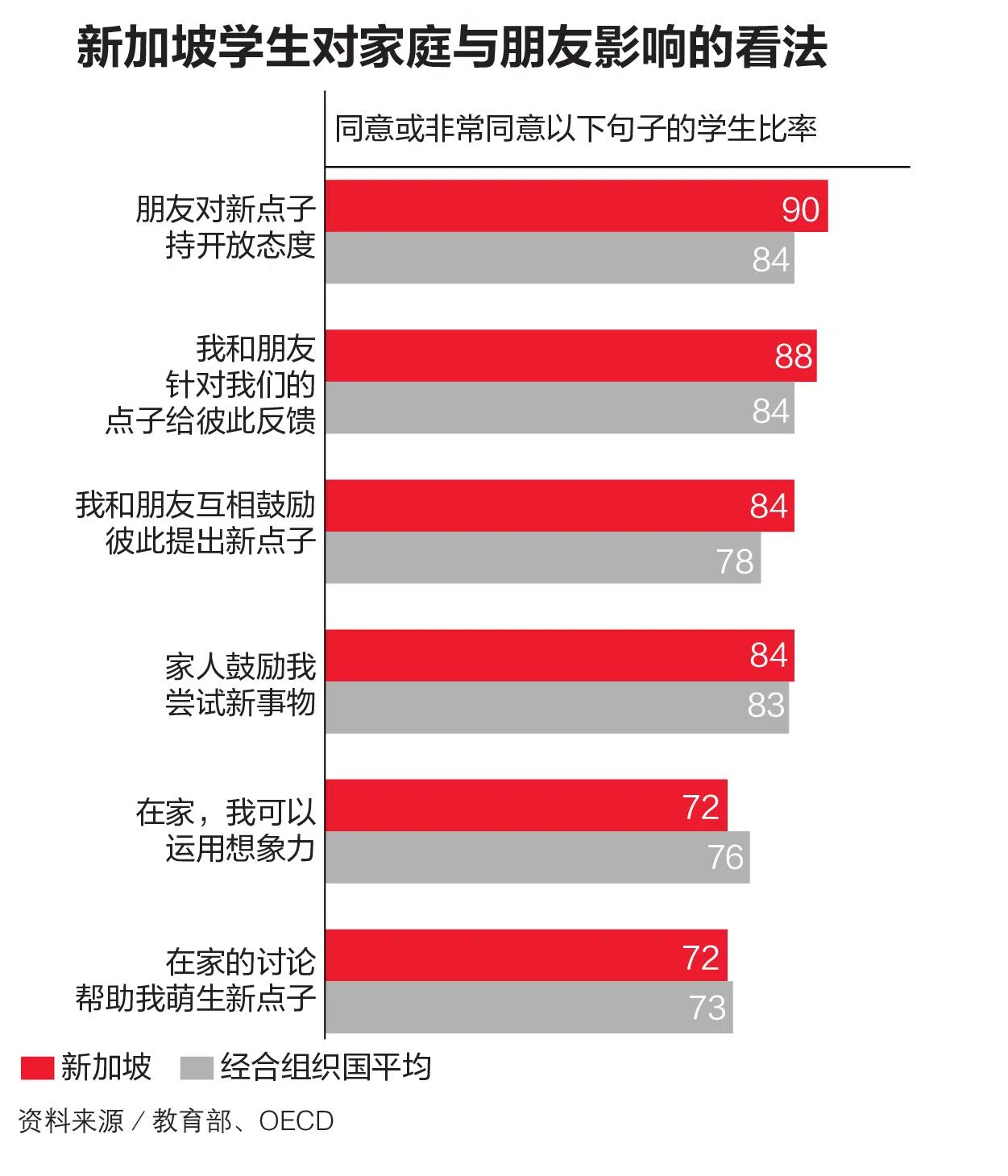 调查也显示,本地家长多数都鼓励孩子勇于尝试。84%的学生表示,家人鼓励他们尝试新事物,这比OECD的平均水平83%略高。