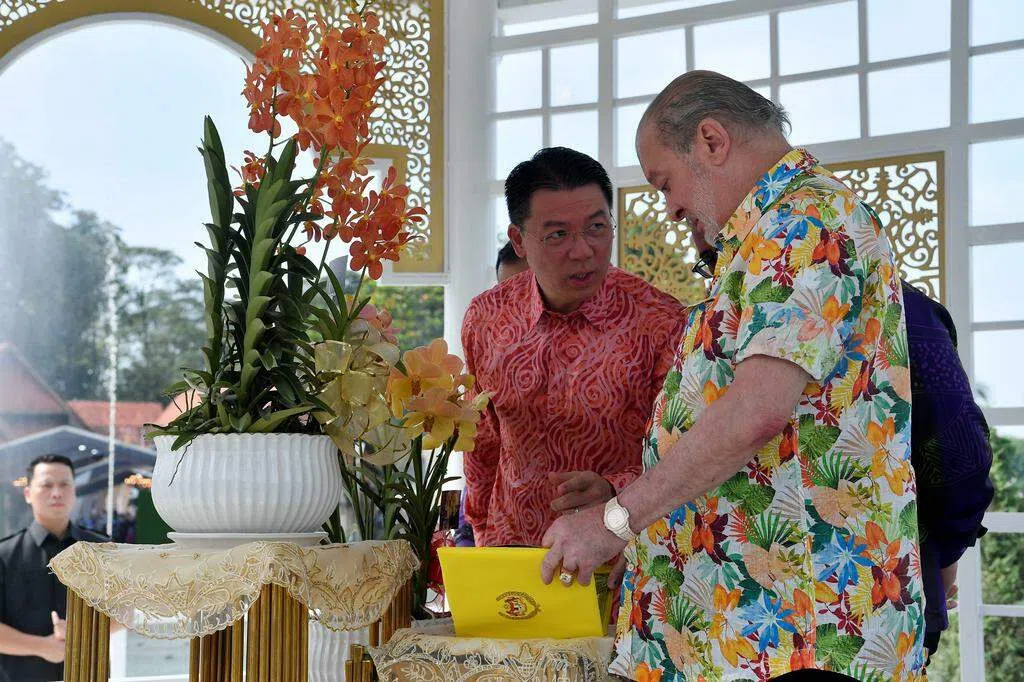 正在我国进行正式访问的洪马内星期二(6月18日)到新加坡植物园出席胡姬花命名仪式,人力部长兼贸工部第二部长陈诗龙医生和国家公园局局长黄攸宁陪同出席。