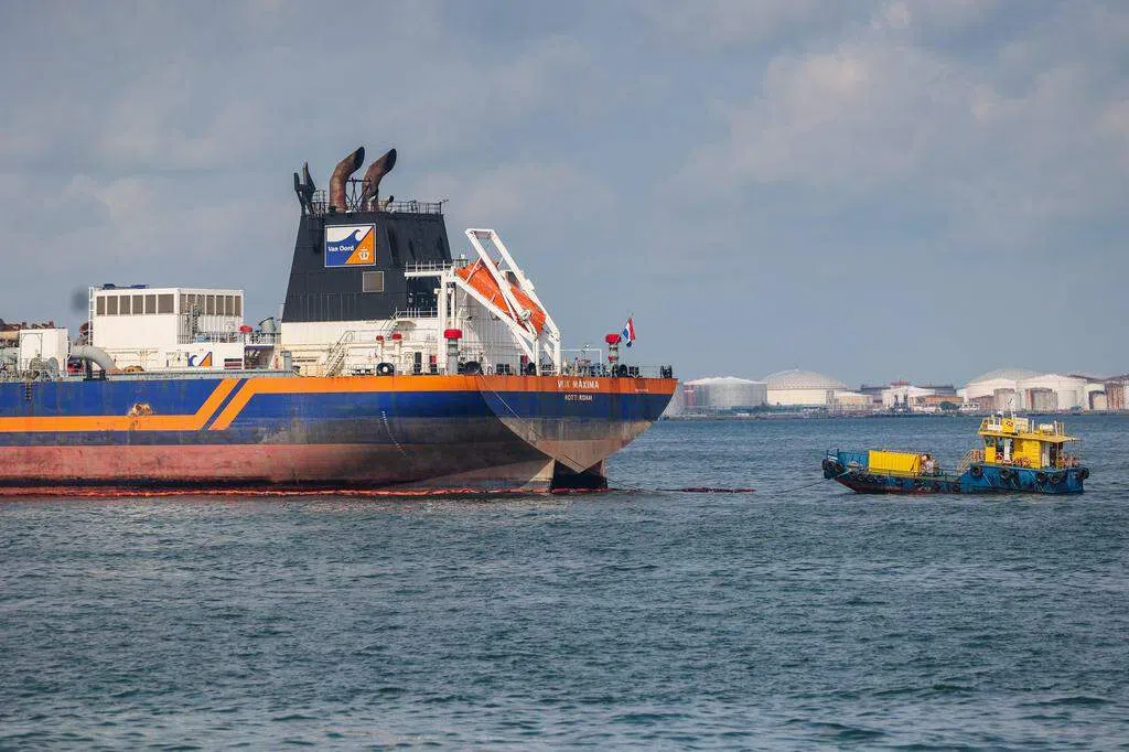 上星期五(6月14日)下午,悬挂荷兰国旗的挖泥船VOX MAXIMA撞上悬挂新加坡国旗的加油船MARINE HONOUR,引发漏油事故。