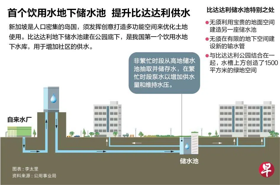 比达达利住宅区建造本地首个储存饮用水的地下储水池,以解决我国用水需求增加和土地空间稀缺的问题。这座斥资约2700万元兴建的地下储水池预计今年第三季启用,高峰时段可同时为8800户家庭供水,还能根据供需自动调节储水和泵水量。