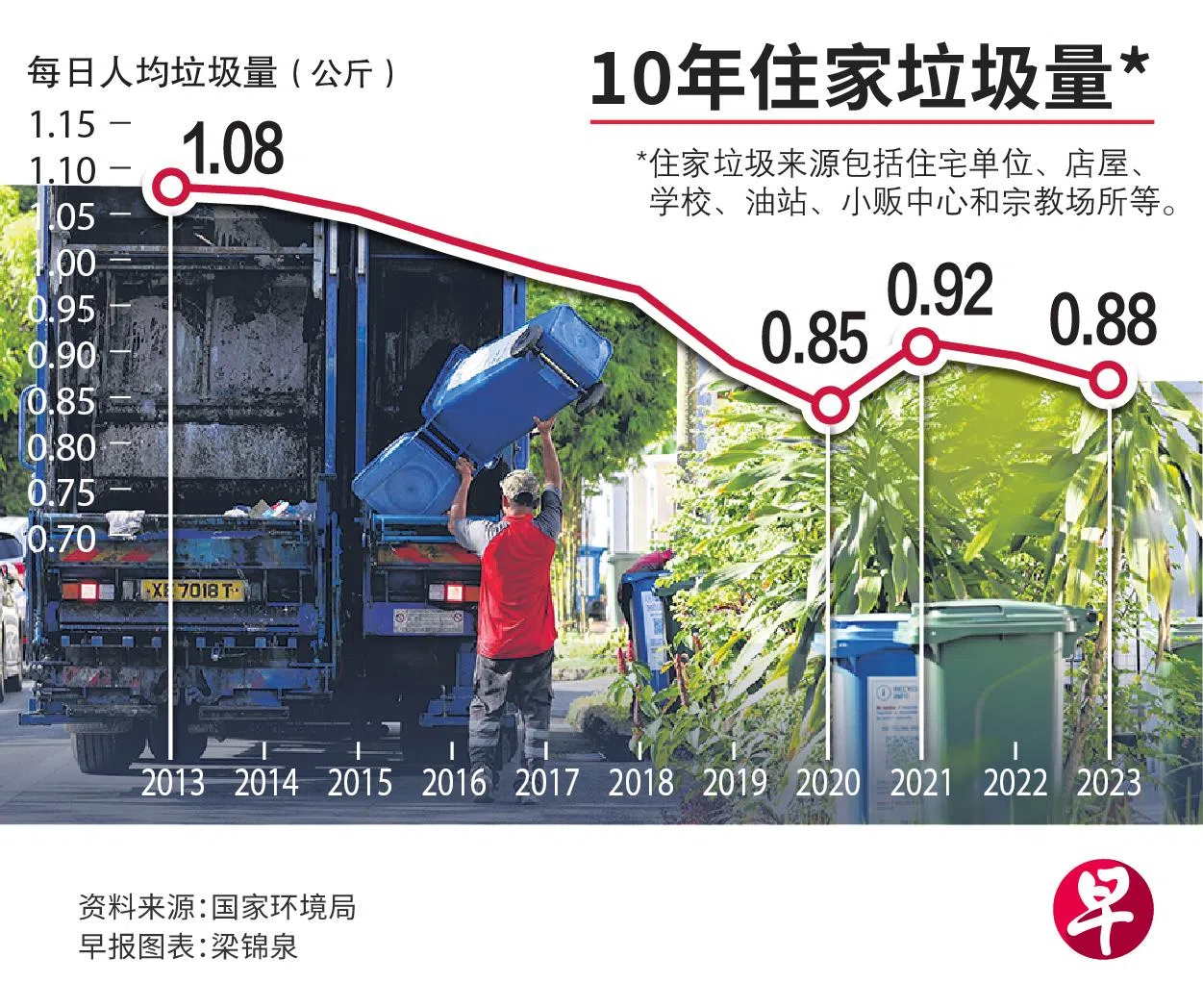 过去10年,在住家垃圾方面,我国每人每日丢弃的垃圾减少超过15%,从2013年的1.08公斤,降至去年0.88公斤。同一时期,非住家垃圾则减超过30%,2013年每一元国内生产总值的垃圾制造量为39.6公斤,去年则是25.7公斤。