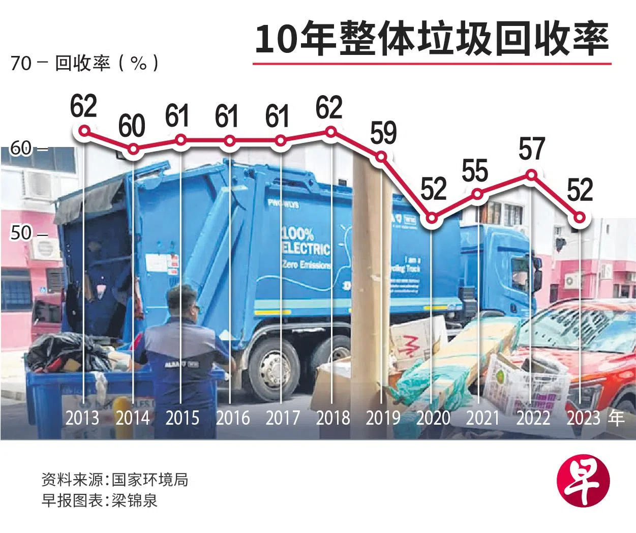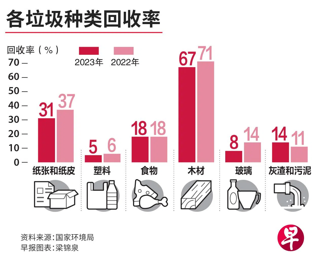 若进一步细分,去年的住家垃圾回收率是12%,与2022年相同;非住家垃圾回收率则从72%跌至67%。