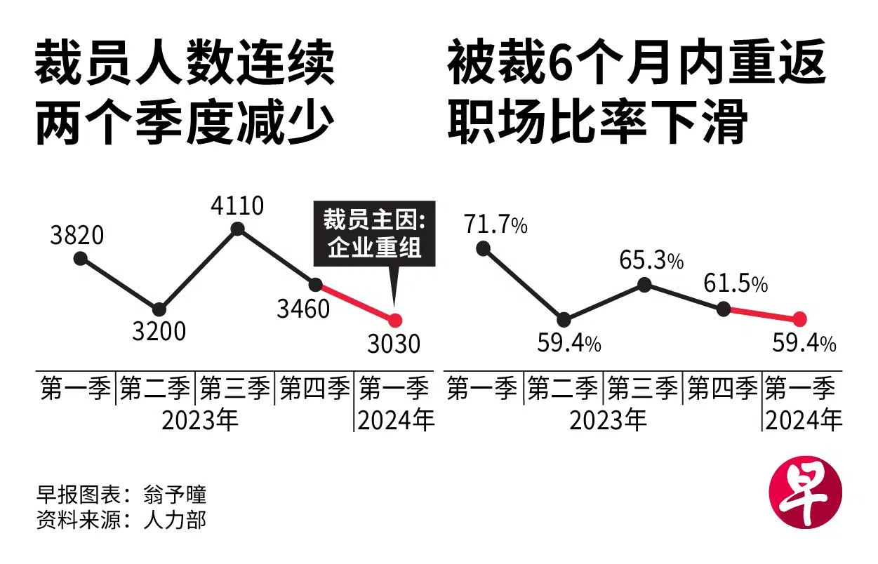 此外,裁员人数在去年第三季达4110人后,连续两个季度减少,降至3030人;这主要是批发贸易和电子制造业等外向型行业被辞退者减少,而企业重组仍是裁员主因。