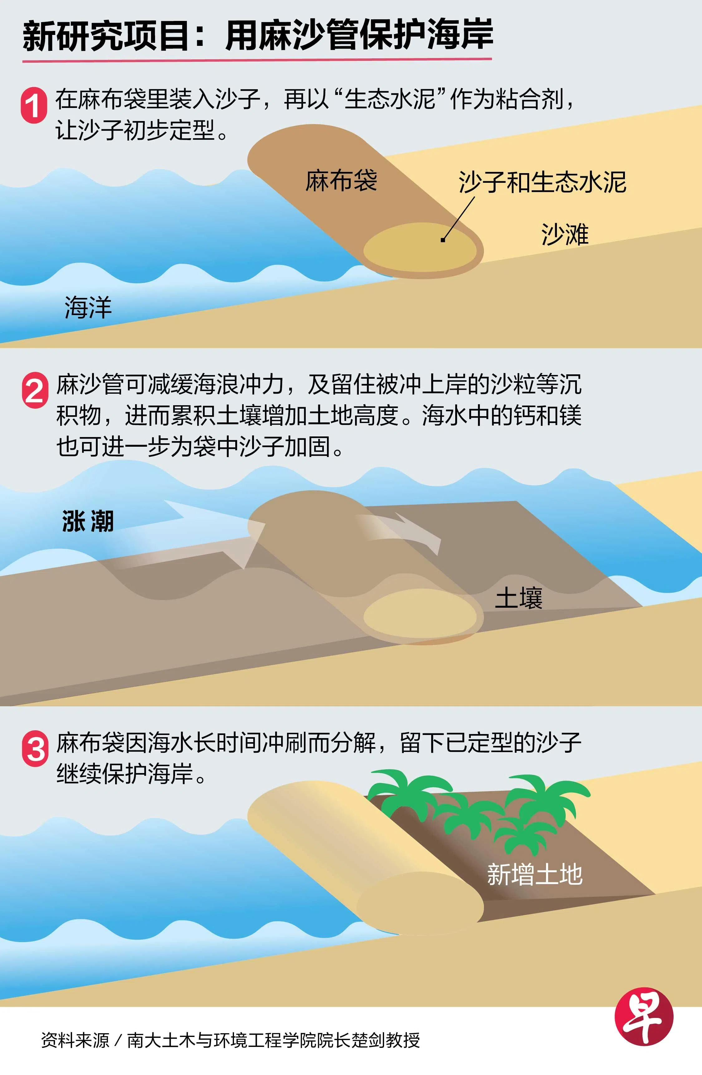 把沙子装入麻布袋制成管状装置,用来减缓海浪冲力。几年后,麻布虽因海水长时间冲刷而分解,但经过特殊处理的沙子早已定型,仍能留在原地,保护海岸不被高涨的海平面侵蚀。