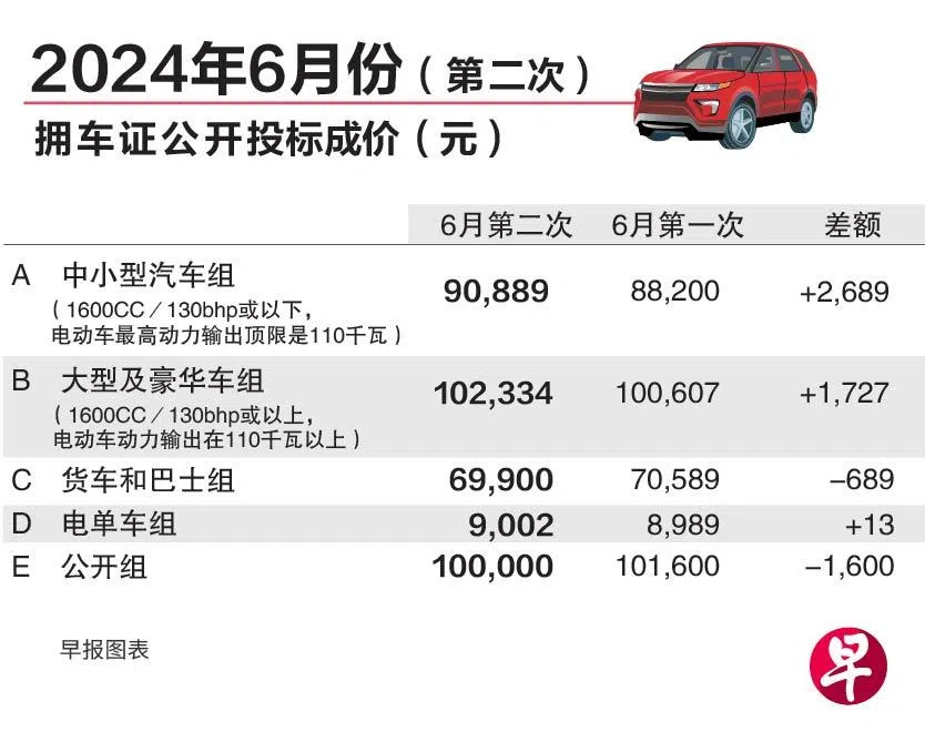 6月第二轮拥车证公开投标活动星期四(6月20日)下午结束,应对大众市场需求的中小型汽车组(A组)成价连续三轮下降后,回升2689元(3.05%),报9万零889元。