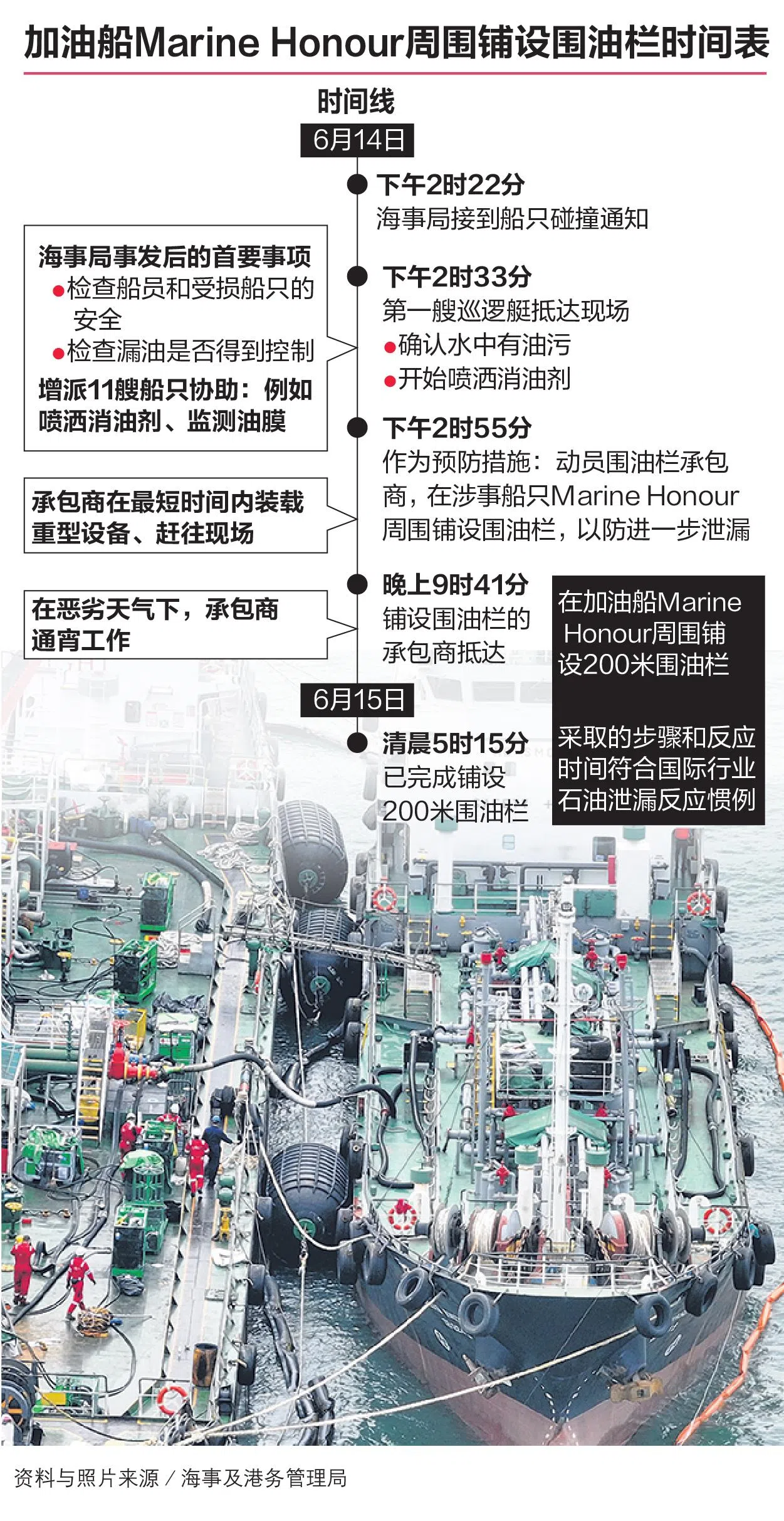 他也说,铺设围油栏的承包商在短时间内装载重型设备,赶往现场并连夜工作,在事发第二天清晨5时15分完成部署,反应时间符合国际行业惯例。