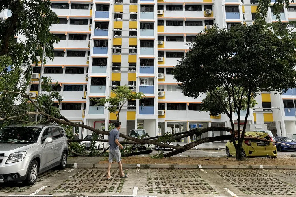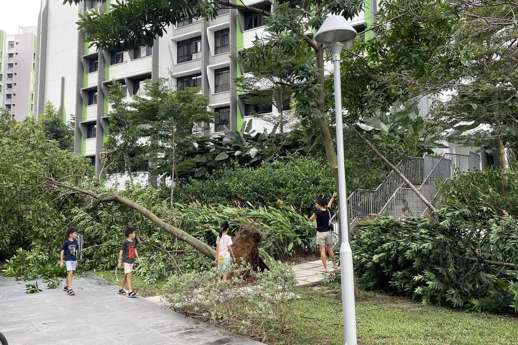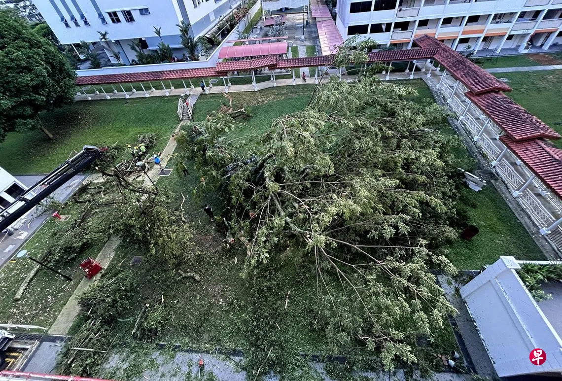 经不起星期五(6月28日)下午的一场狂风暴雨,超过50年树龄的大树被连根拔起,倒向附近组屋,部分树冠还插入走廊,母女称侥幸逃过一劫。