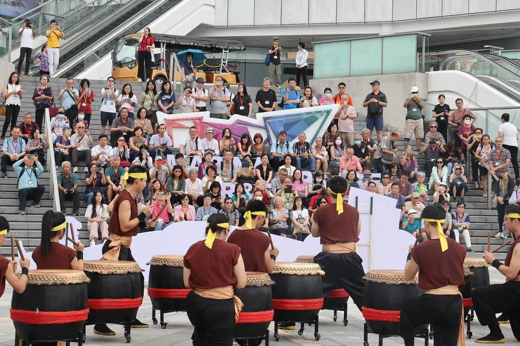 新柔长堤启用100周年之际,《联合早报》执行总编辑韩咏梅(前排右二)带着约140名百年新山文史美食之旅的参与者,到访新加坡华人最先涉足柔佛的地点之一——陈厝港,并同陈厝港灵山宫理事会主席洪德荣(前排右三)一起栽种甘蜜树,象征两地人长存的情谊。