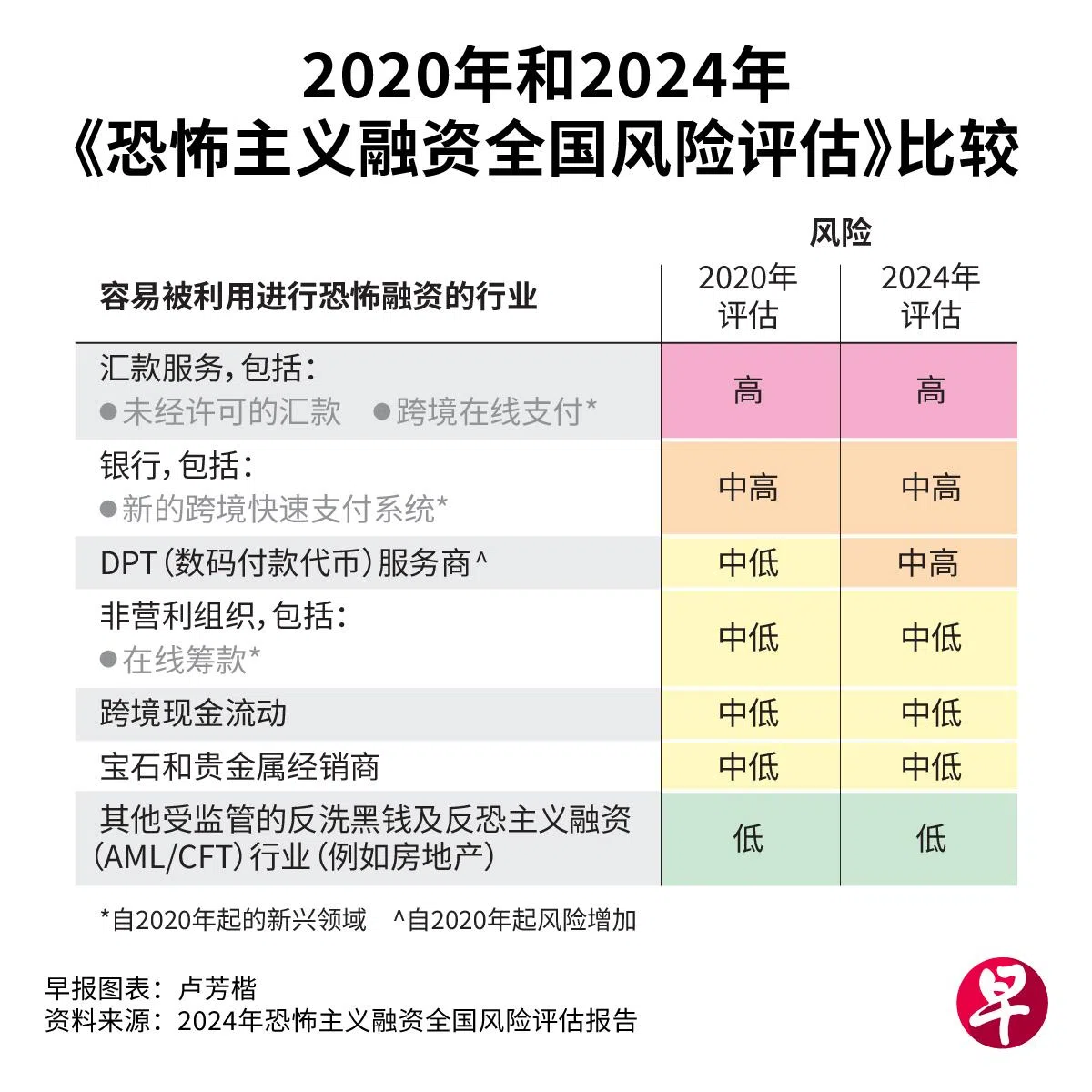 根据内政部、财政部和新加坡金融管理局星期一(7月1日)联合发布的更新版《恐怖主义融资全国风险评估》(Terrorism Financing National Risk Assessment)报告,包括未经许可汇款和跨境在线支付在内的汇款服务,仍处于高风险。